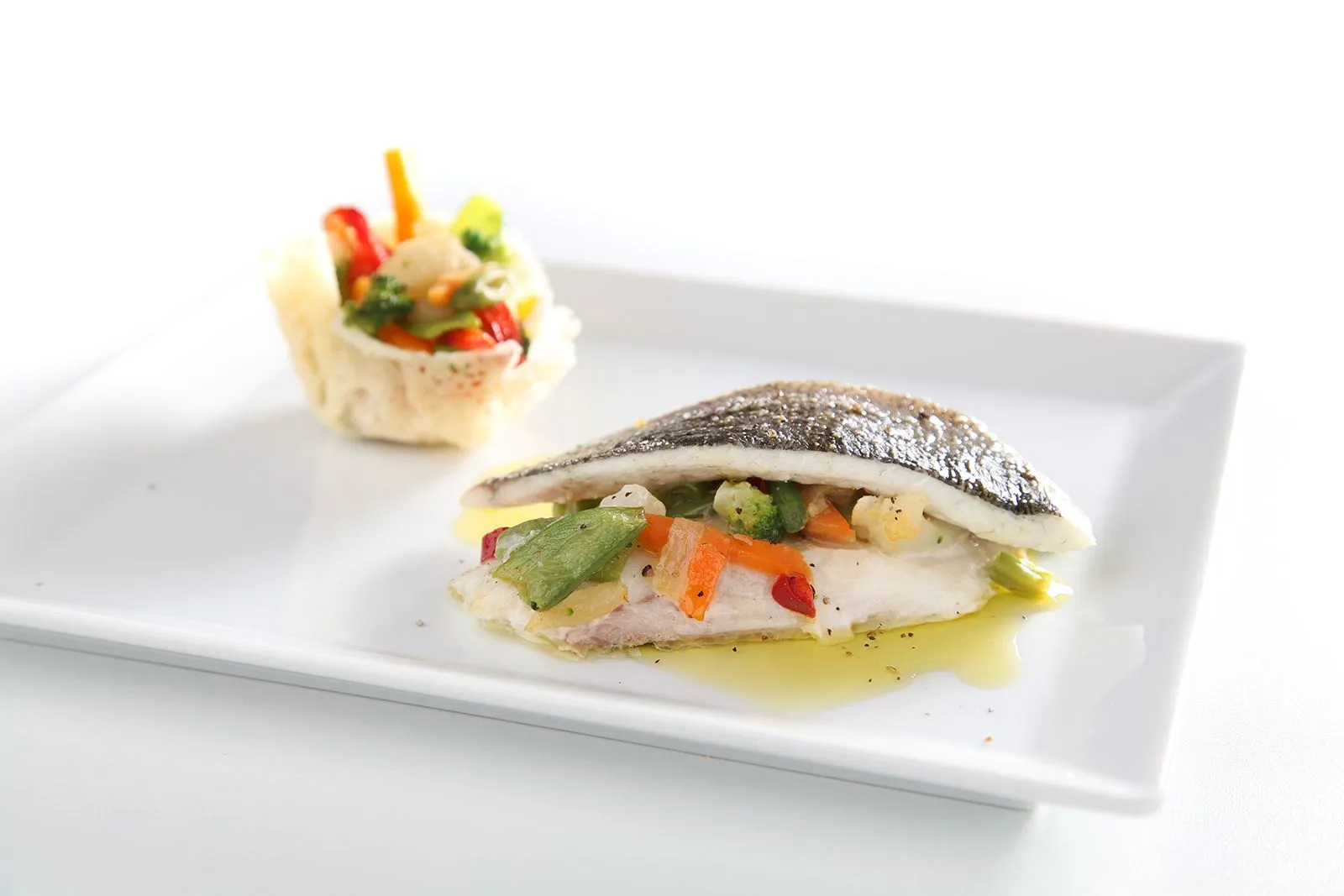 Put the sea bream sandwiches on flat dishes, then place the parmesan baskets filled with some Light Veggie Mix on the side and season with the mixture obtained from baking the fish.