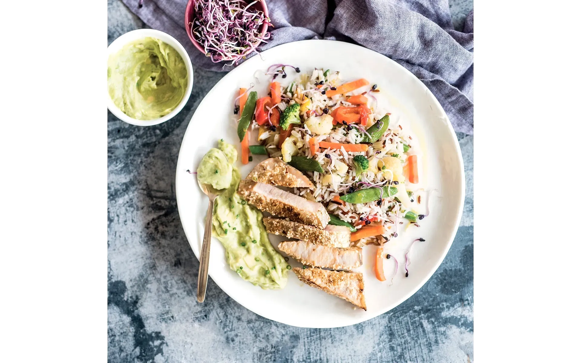 Contorno Leggerezza Orogel: un piatto di insalata fresca con pollo e cremoso avocado.