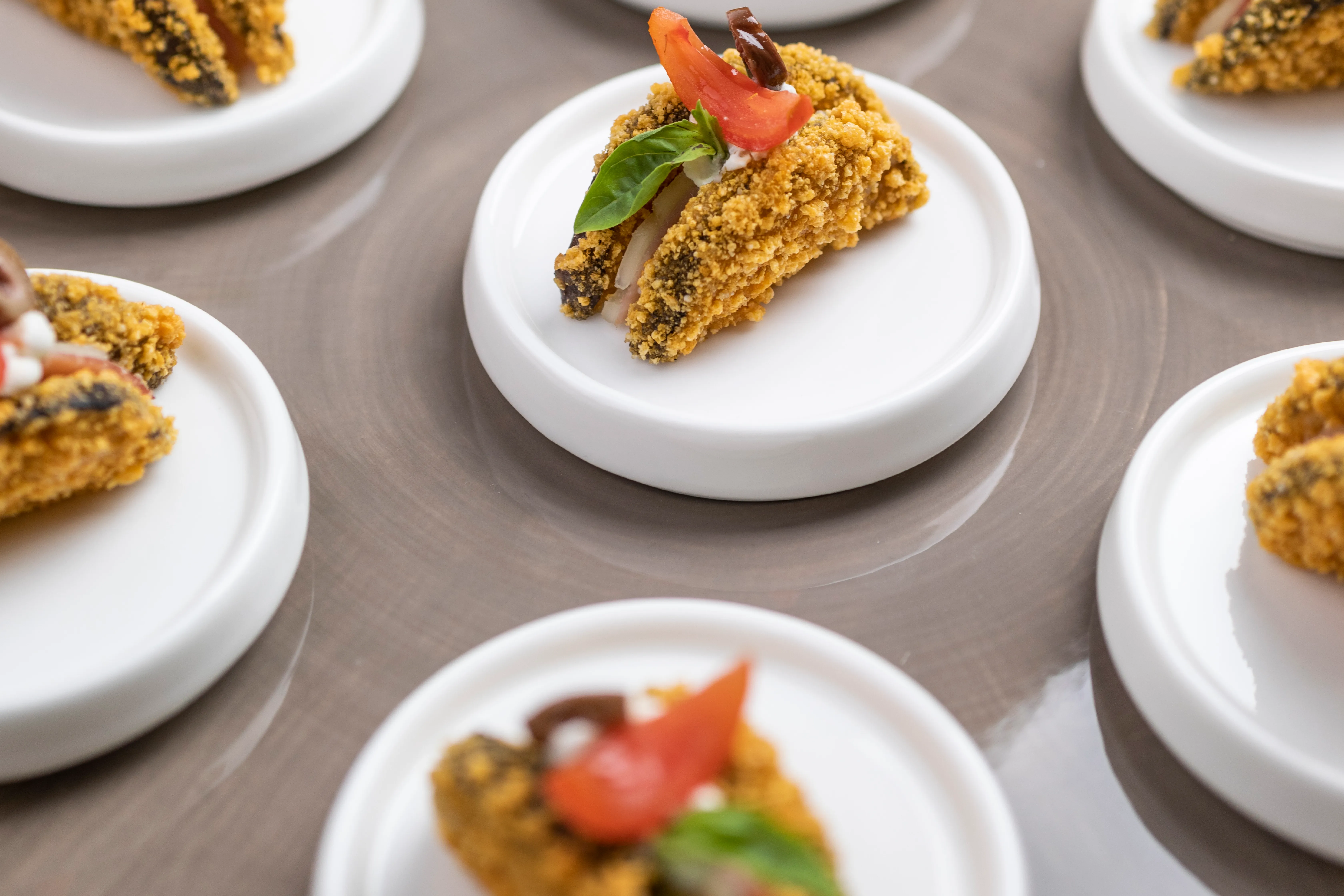 4. Comporre i finger food con la chips di mais, un cucchiaino di crema ai funghi e una doratina.