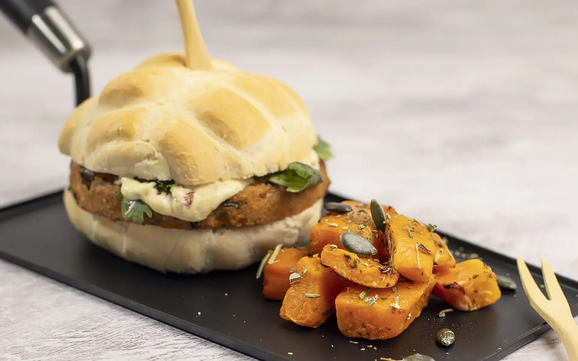 Panino con burger vegetale e zucca arrostita: una proposta 100% vegetale per la ristorazione veloce, con ingredienti Orogel Food Service che garantiscono praticità, resa costante e gusto contemporaneo.
