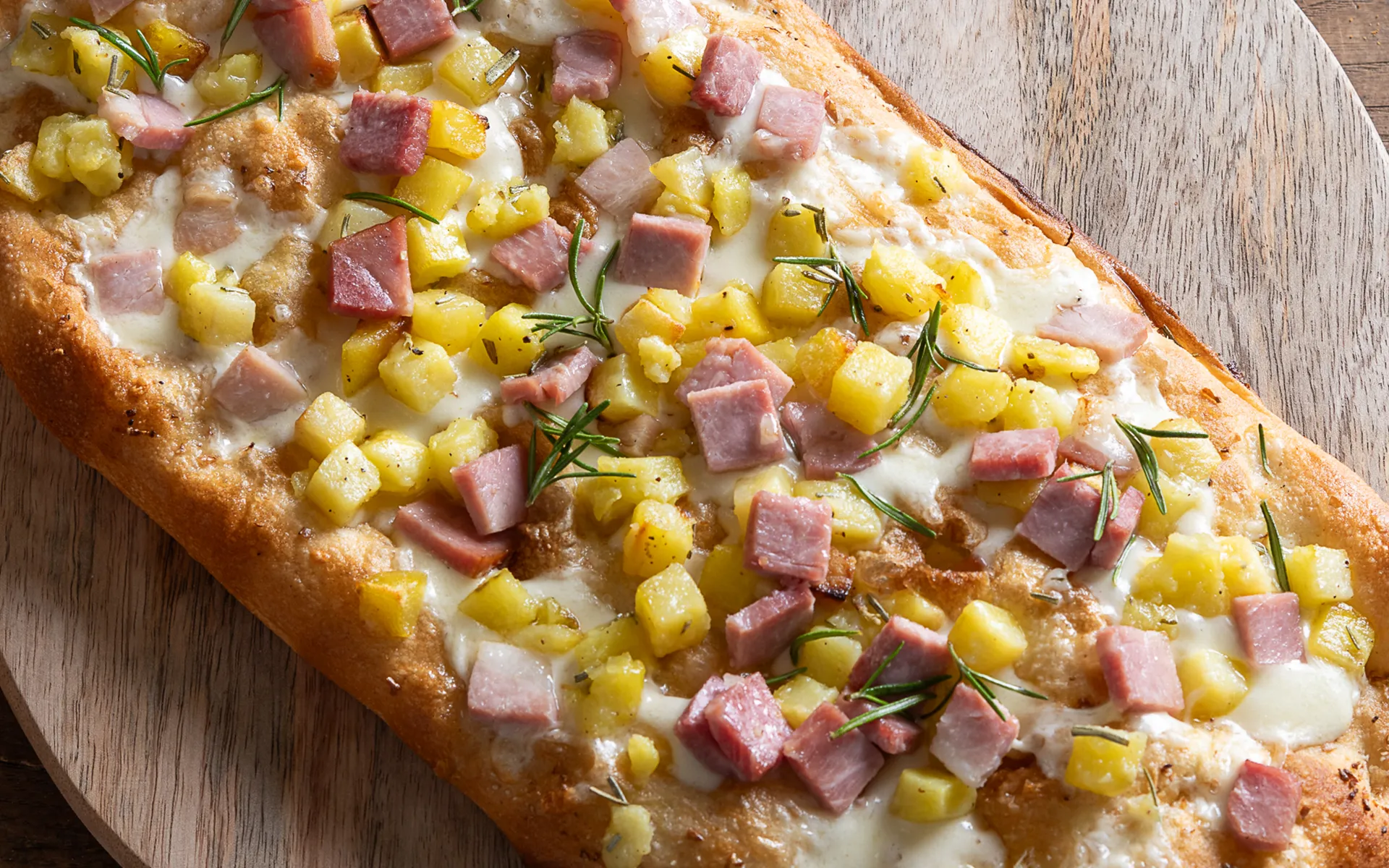 Pizza alla pala con mozzarella, patate a cubetti, prosciutto cotto e rosmarino