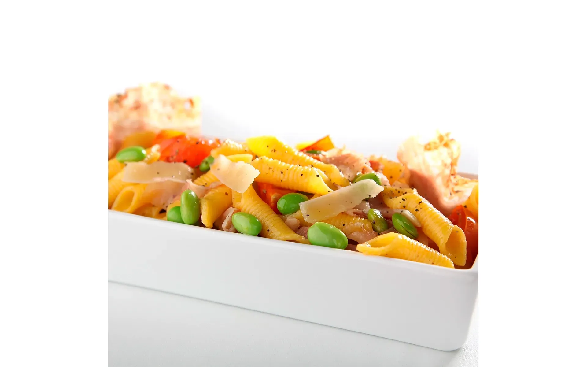 Garganelli con edamame, pomodorini, pancetta croccante e scaglie di Parmigiano