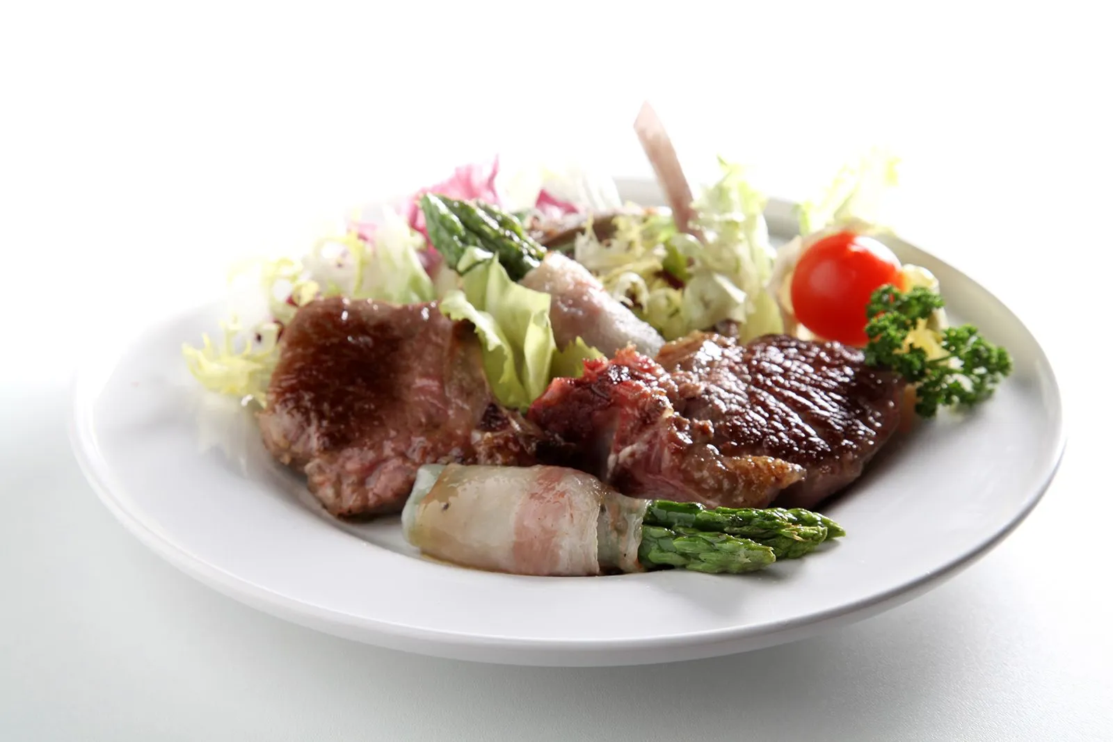4. Comporre il piatto, adagiando i mazzetti di asparagi su di un letto di insalata mista di stagione e disponendo le costolette di agnello a ventaglio.