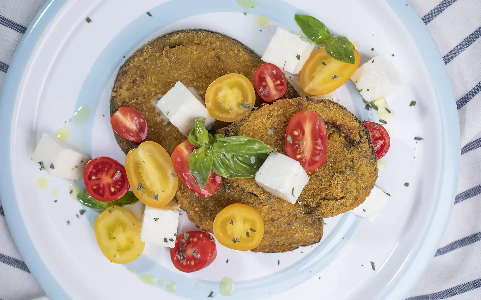 3. Disporre in un piatto la Cotoletta di melanzane e la caprese. Aggiungere un filo d’olio extravergine d’oliva.
