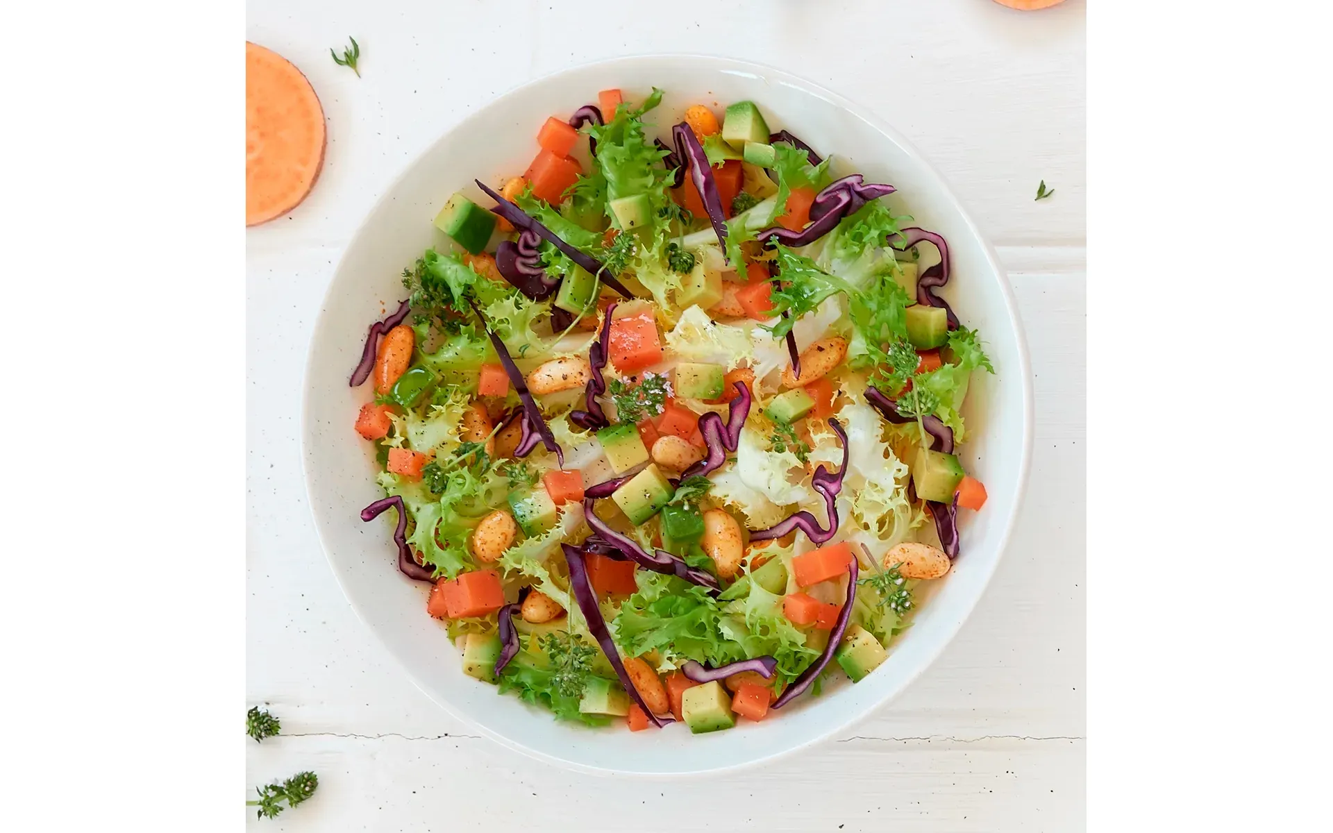 4. Componi la tua power bowl: prima metti l'insalata riccia e il cavolo viola. Aggiungi poi le patate, i cannellini e l'avocado. Condisci tutto con un filo d'olio e un pizzico di sale, se lo desideri!