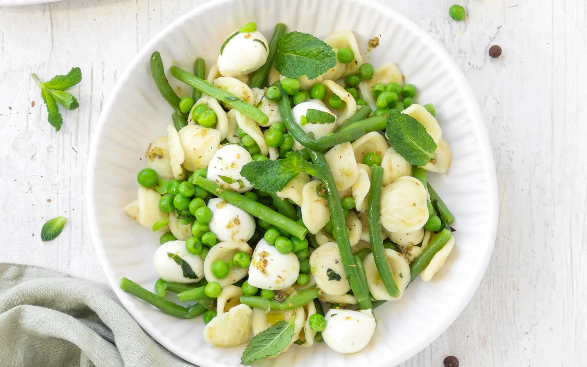 Un piatto di pasta fredda in insalata, con fagiolini e piselli, la freschezza della menta e il tocco morbido e delicato delle ciliegine di mozzarella.
