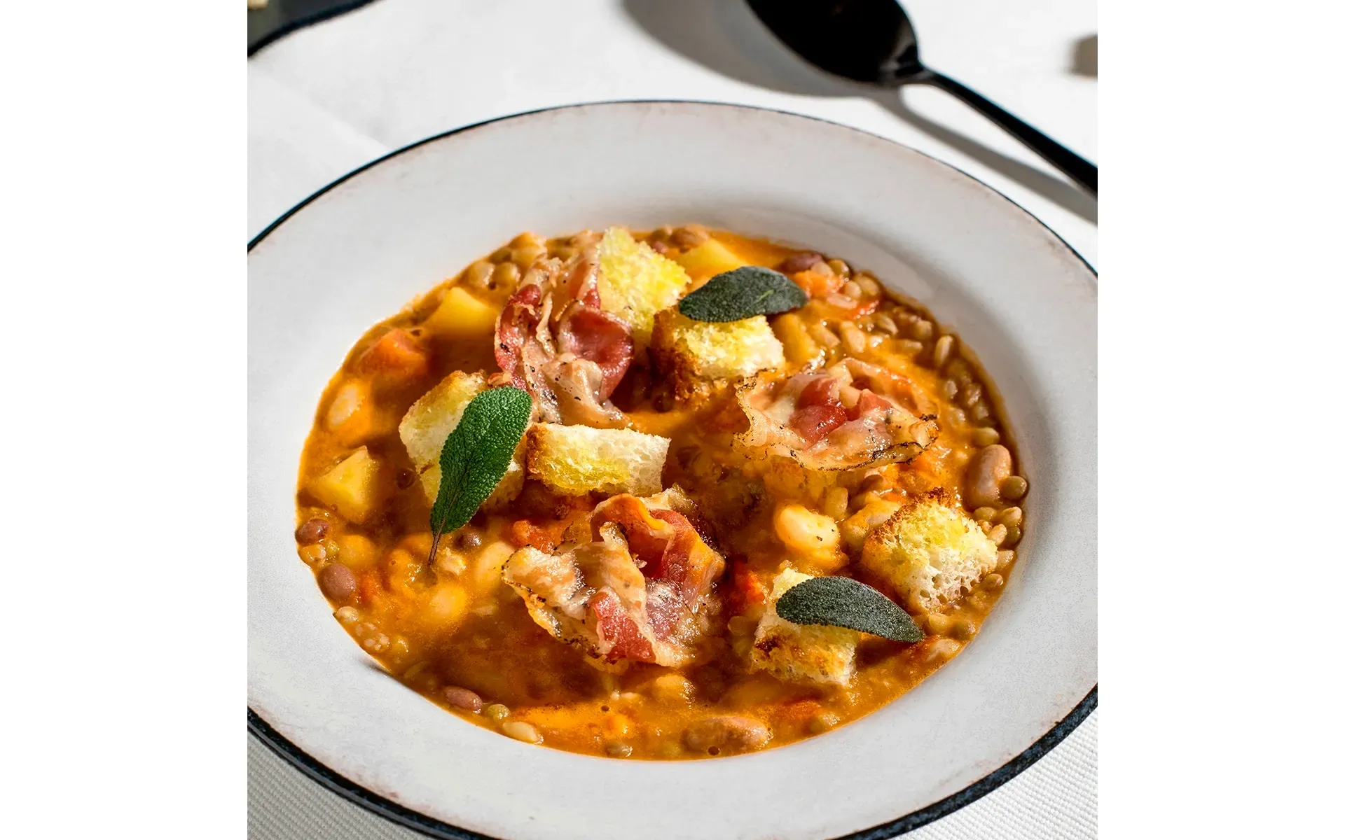 Virtù di Zuppa Antichi Sapori con crostini, pancetta e rosmarino